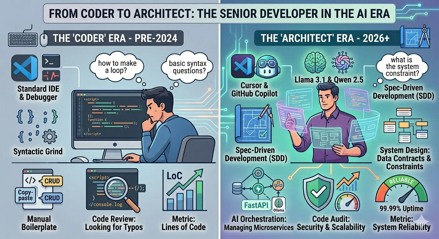 The transition from “Coder” to “Architect” is the defining career pivot of 2026. Syntax is no longer the bottleneck; with local LLMs like Llama 3.1 and Qwen 2.5 embedded in tools like Cursor and GitHub Copilot, the “how” of coding is solved by machines in real-time.